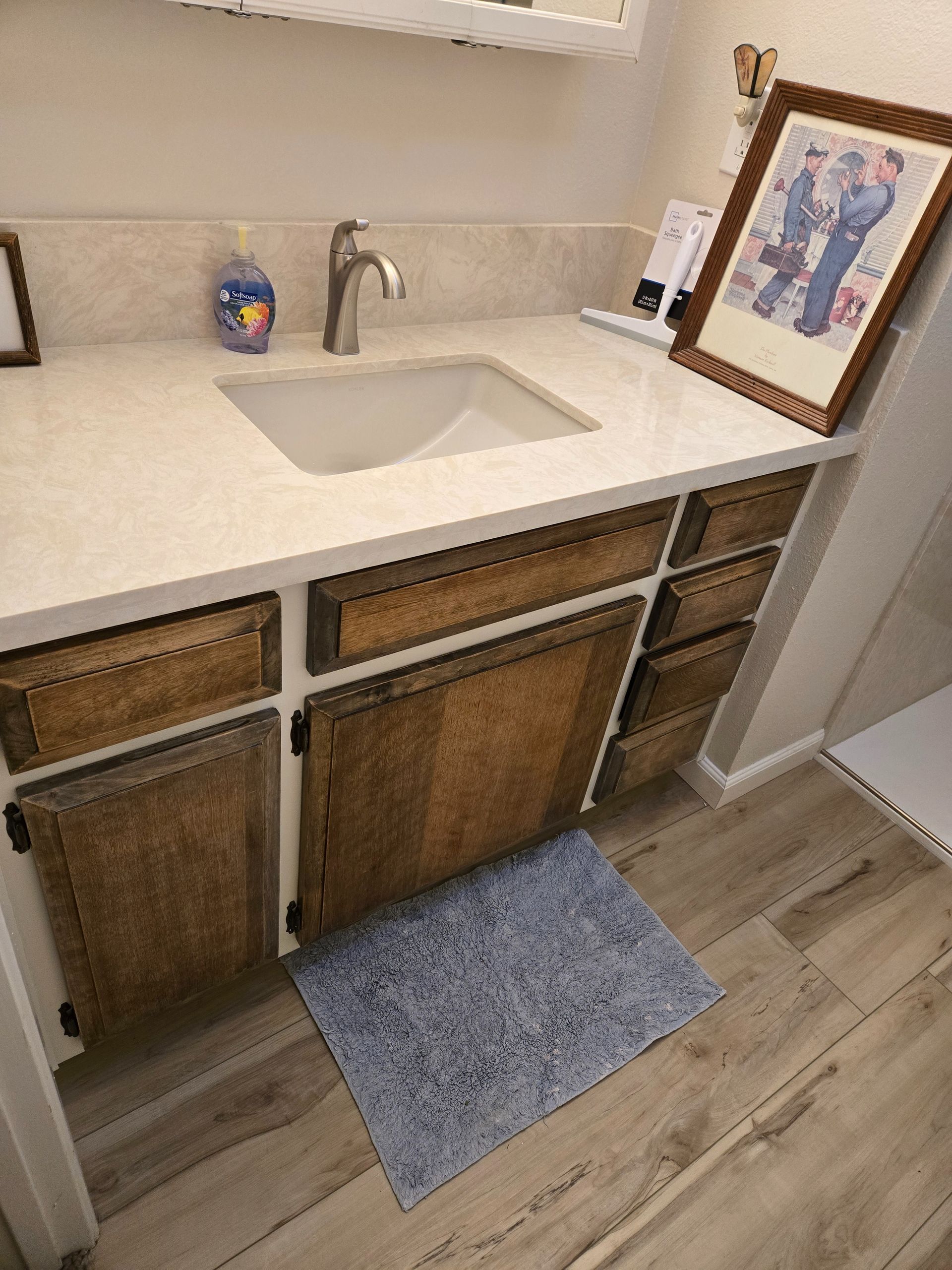 - Flooring: The old floor was replaced with waterproof Luxury Vinyl Plank (LVP), providing a durable, slip-resistant surface that adds warmth to the room.
